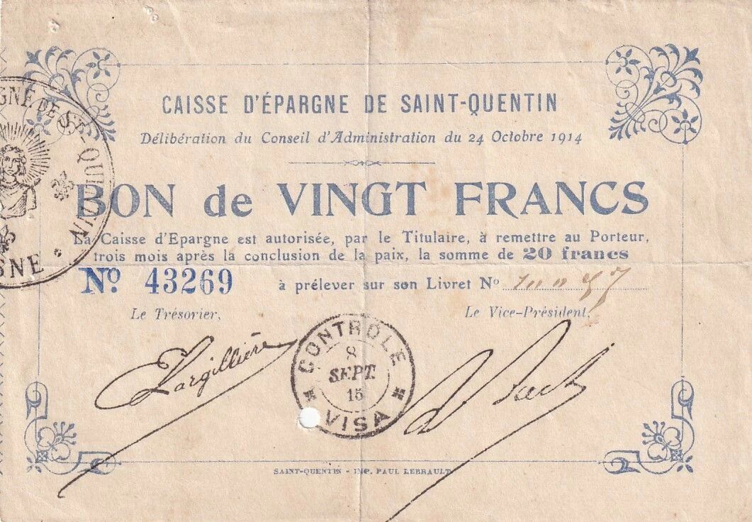 This 5 Francs banknote is a Necessity Note issued by the city of Saint-Quentin on August 20, 1915 (Series E) during the First World War, referenced Pirot 02-2045.
