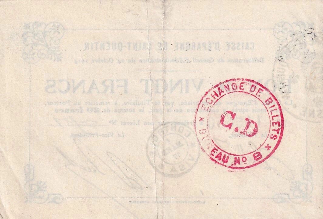 This 20 franc note was issued by the Caisse d'Épargne (Savings Bank) of Saint-Quentin, following a deliberation by the Board of Directors dated October 24, 1914. This cash voucher entitles the bearer to withdraw the sum of twenty francs from their savings account, the number of which must be indicated, three months after the conclusion of peace. The serial number printed on the note is No. 118650. It is signed by the Treasurer and the Vice-President of the bank.