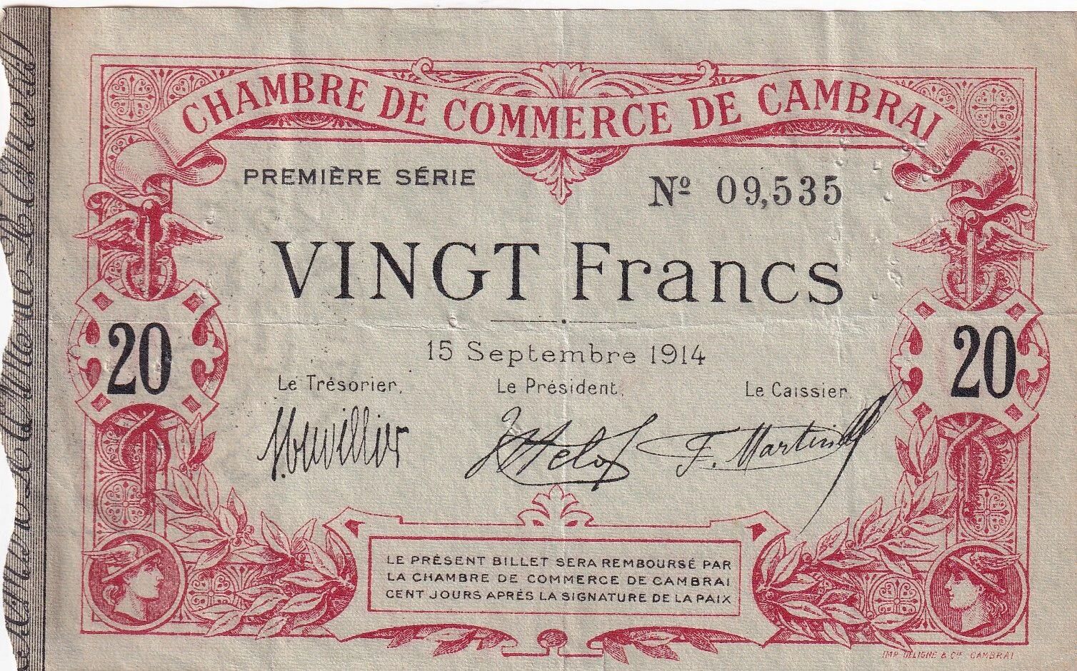 Ce billet de banque de 20 francs a été émis par la Chambre de Commerce de Cambrai, en France, le 15 septembre 1914. Il appartient à la première série de cette émission spécifique.