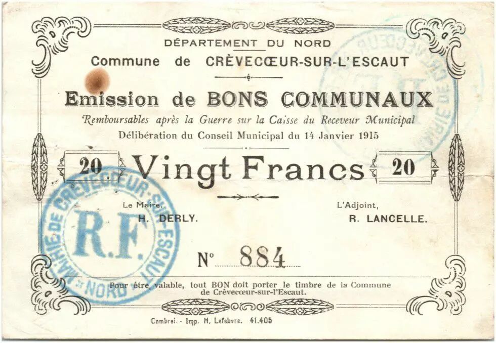 Billet France 20 Francs Crevecoeur-Sur-L'escaut Commune - 1915