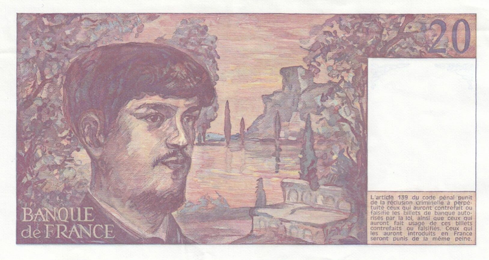 L'avers du billet représente Claude Debussy, compositeur français, né en 1862 et décédé en 1918. Son portrait est mis en valeur, accompagné d'une représentation stylisée de notes de musique et de vagues, évoquant son ?uvre musicale souvent inspirée par la nature. La valeur nominale de 20 francs est indiquée en toutes lettres et en chiffres. La mention "Banque de France" est également présente.