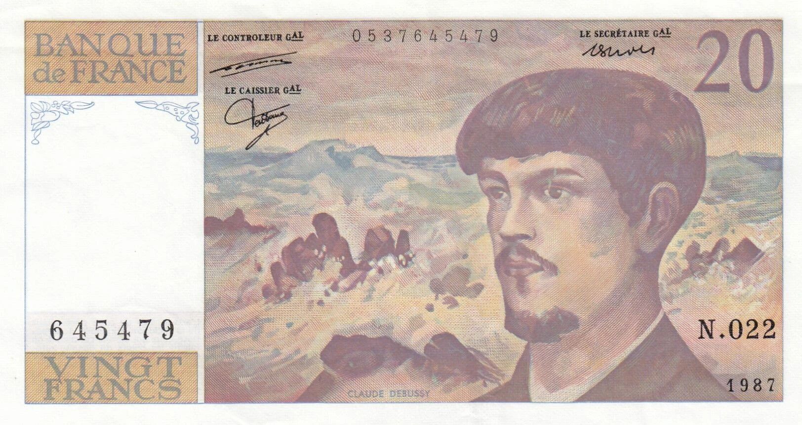 The obverse of the banknote depicts Claude Debussy, a French composer, born in 1862 and died in 1918. His portrait is highlighted, accompanied by a stylized representation of musical notes and waves, evoking his musical work often inspired by nature. The face value of 20 francs is indicated in words and numbers. The mention "Banque de France" is also present.