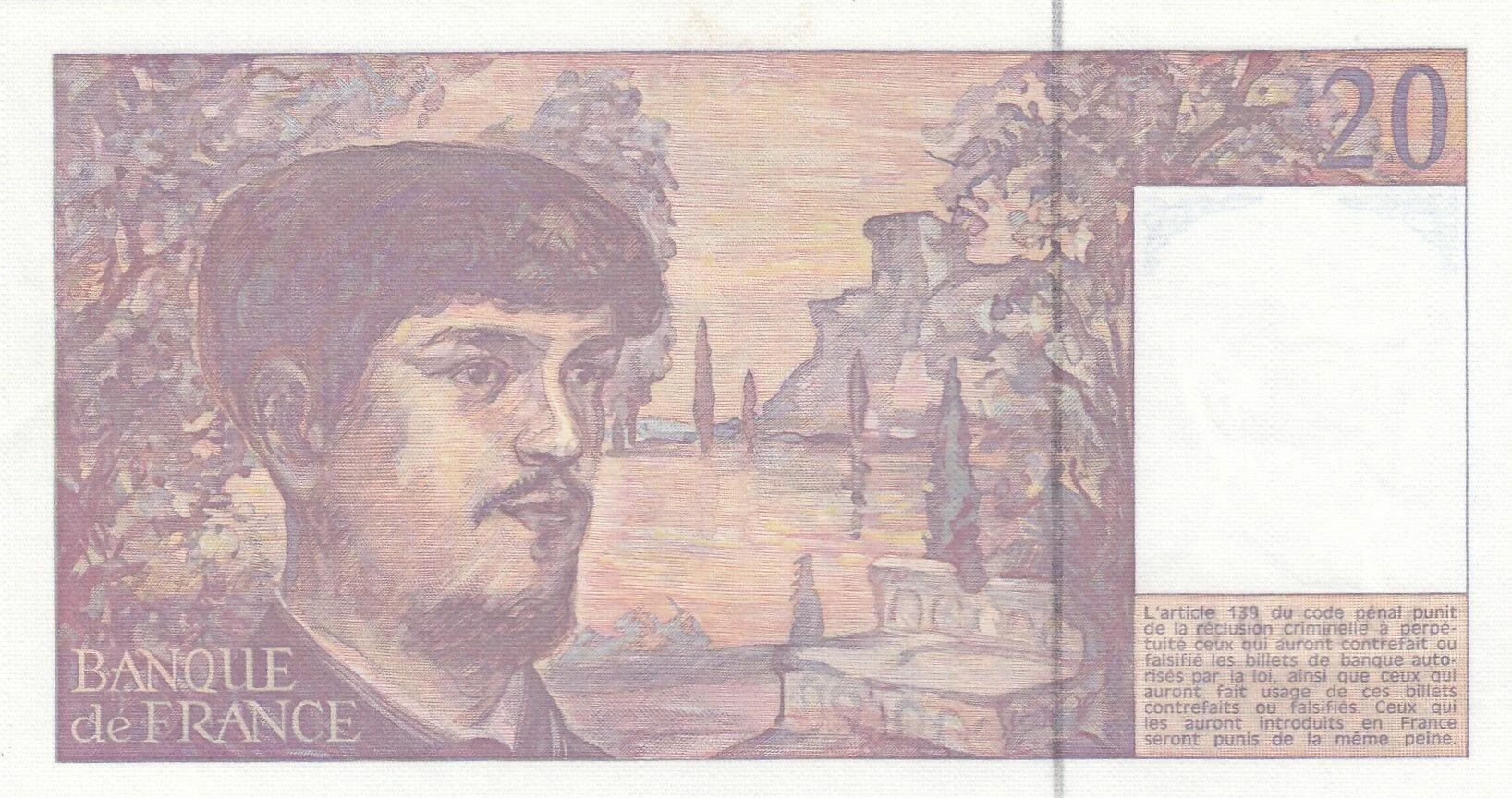 Ce billet a été émis par la Banque de France. Il commémore la figure de Claude Debussy et son influence majeure sur la musique française et internationale. Le billet de 20 francs Debussy a cessé d'avoir cours légal avec l'introduction de l'euro en 2002.