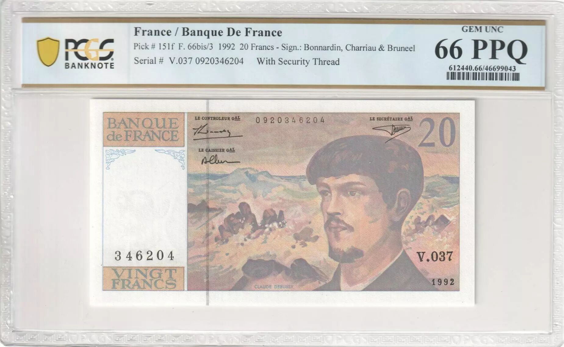 Billet France 20 Francs - Debussy - 1992 - Série V.037 - PCGS 66 PPQ