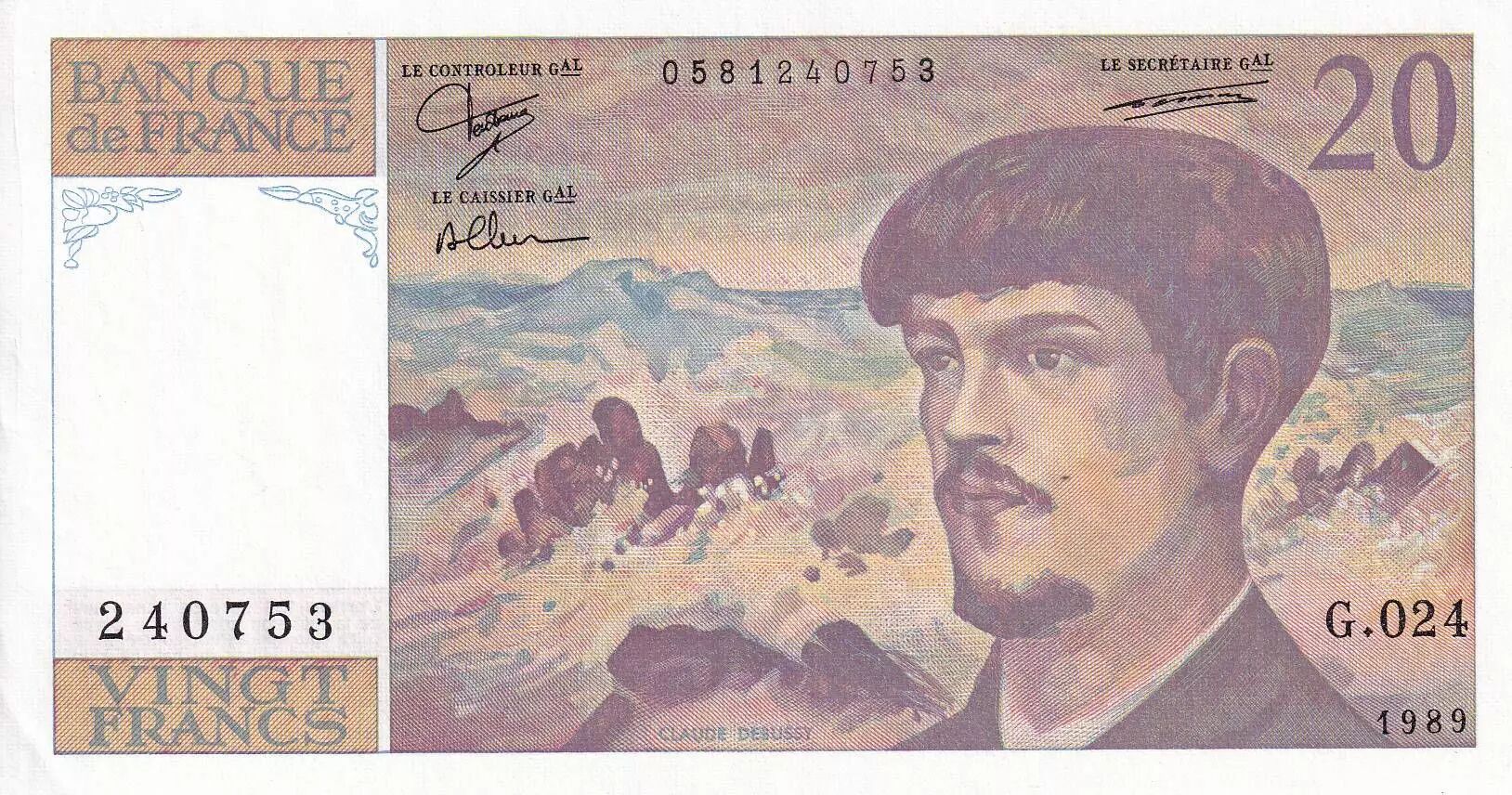 Accueil > Billets Français > Billets Banque de France > Billets 20 Francs > Debussy type 1980 (1980-1997) > France 20 Francs - Debussy - Série G.024 - 1989 - SPL+ - F.66.10
