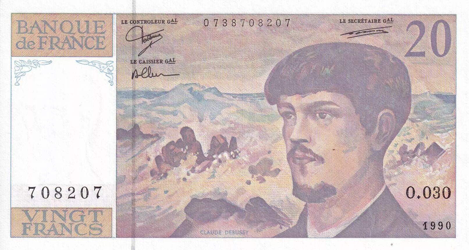 Accueil > Billets Français > Billets Banque de France > Billets 20 Francs > Debussy type 1980 (1980-1997) > France 20 Francs - Debussy - Série O.030 - 1990 - NEUF - F.66bis.01