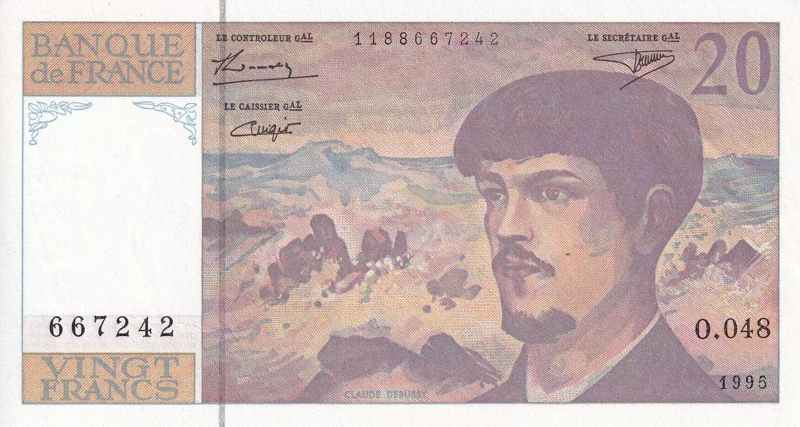 Accueil > Billets Français > Billets Banque de France > Billets 20 Francs > Debussy type 1980 (1980-1997) > France 20 Francs - Debussy - Série O.048 - 1995 - NEUF - F.66ter.01
