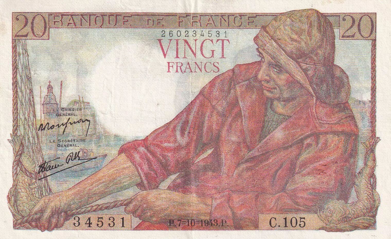 Banknote France 20 Francs - Fisher - 07-10-1943 - Serial C.105 - P.100
