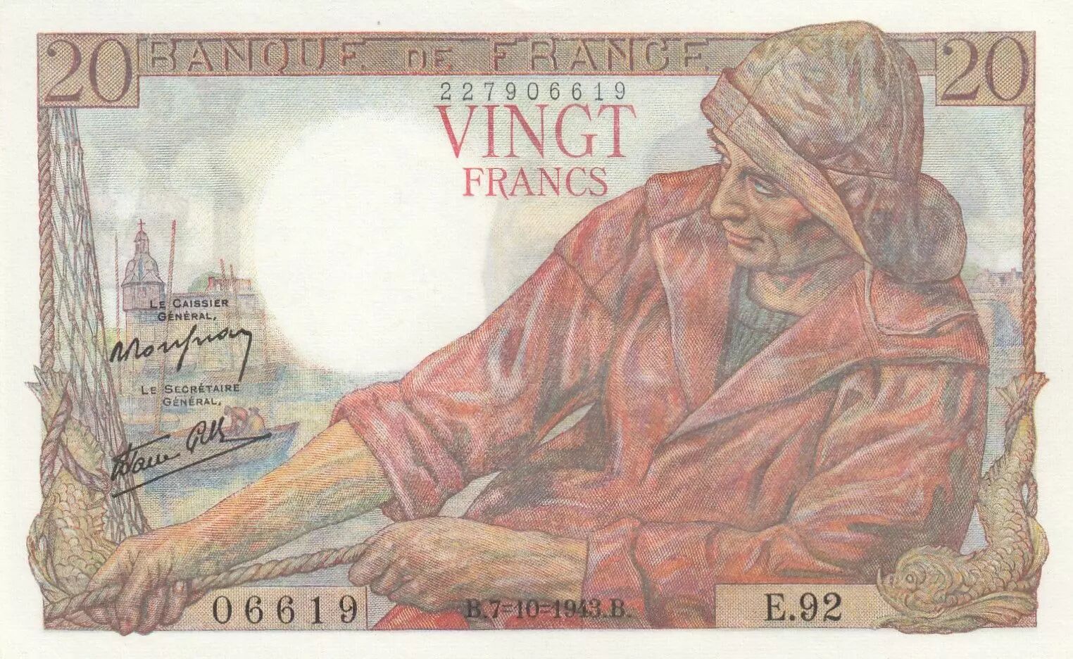 Home > > France 20 Francs - Fisher - 07-10-1943 - Serial E.92