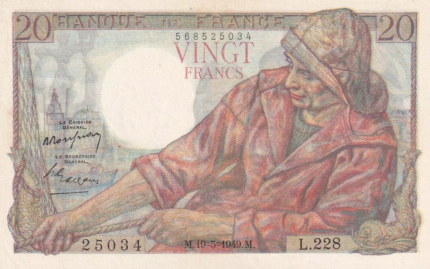 Banknote France 20 Francs - Fisher - 19-05-1949 - Serial L.228 - P.100