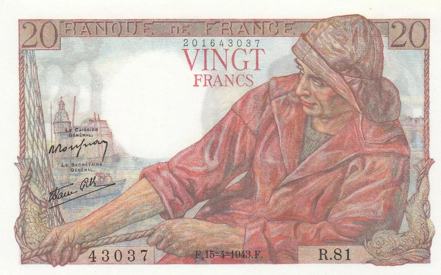 Home > > France 20 Francs - Fisherman - 15-04-1943 - Serial R.81 - P.100
