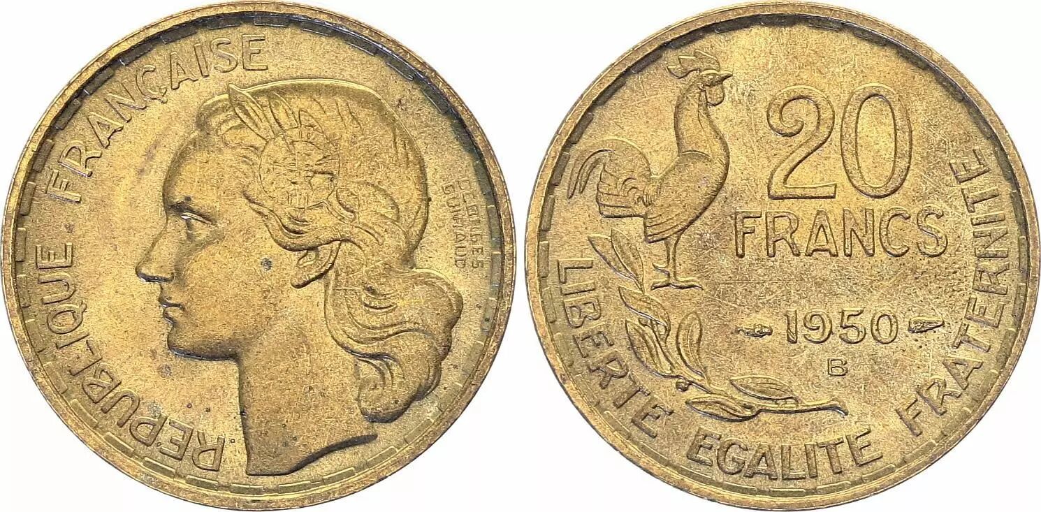Cette pièce de 20 francs, frappée en 1950, est une production française. Elle est identifiable par sa composition en bronze-aluminium. L'atelier de frappe est désigné par la lettre "B".
