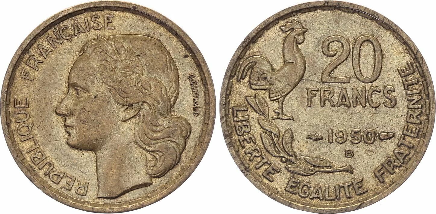 Cette pièce de 20 francs, frappée en 1950, est une production française. Elle est identifiable par sa composition en bronze-aluminium. L'atelier de frappe est désigné par la lettre "B".