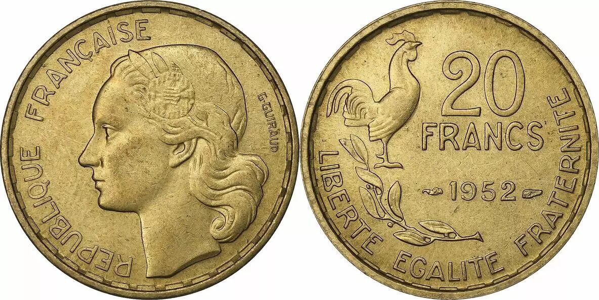 La pièce de monnaie de 20 francs Guiraud, frappée en 1952, est une pièce de circulation française. Sa composition est en bronze-aluminium, un alliage couramment utilisé pour les pièces de monnaie en raison de sa durabilité et de sa résistance à la corrosion.