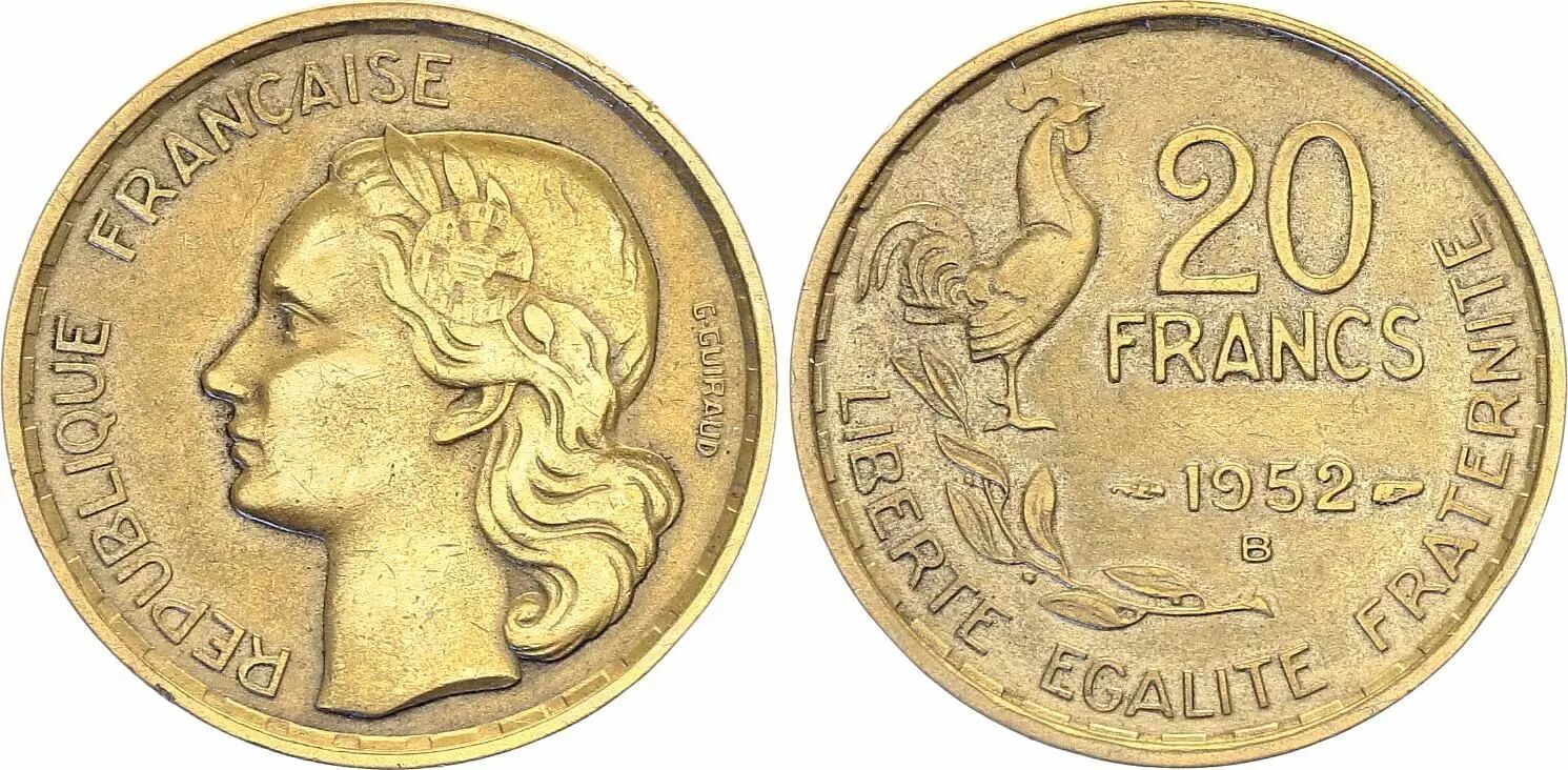 La pièce de monnaie de 20 francs Guiraud, datée de 1952, est une production française. Elle appartient à la catégorie des pièces de circulation courante émises en France durant cette période.