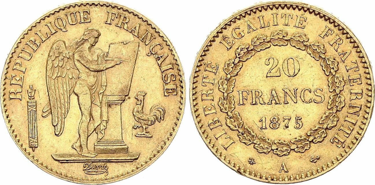 Cette pièce a été émise par la France durant la Troisième République (1870-1940). Elle est classée comme une pièce courante, produite entre 1871 et 1898, avec une émission en 1875 de 11 677 031 d'exemplaires. La devise utilisée est le Franc (1795-1959). Augustin Dupré est le graveur de cette pièce.