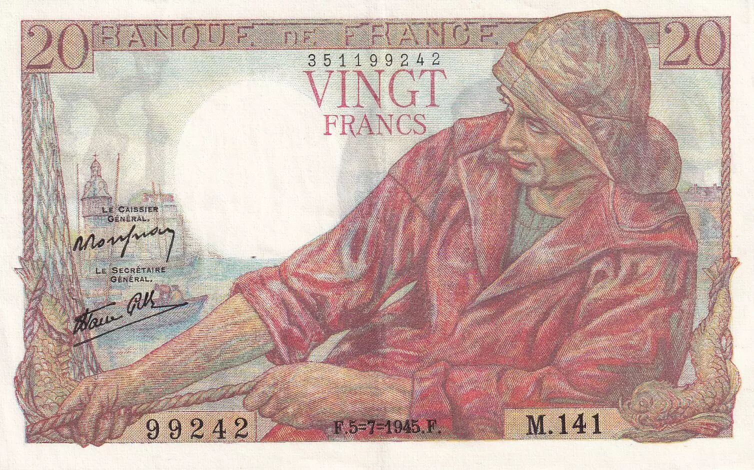 Accueil > Archivage > France 20 Francs - Pêcheur - 05-07-1945 - Série M.141 - F.13.10