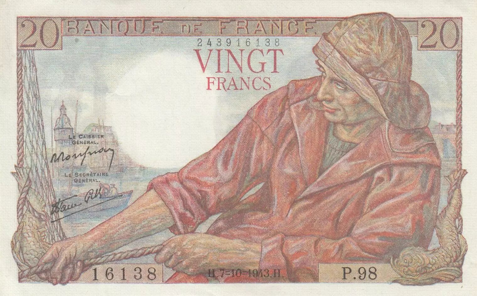 Billet France 20 Francs - Pêcheur - 07-10-1943 - Série P.98