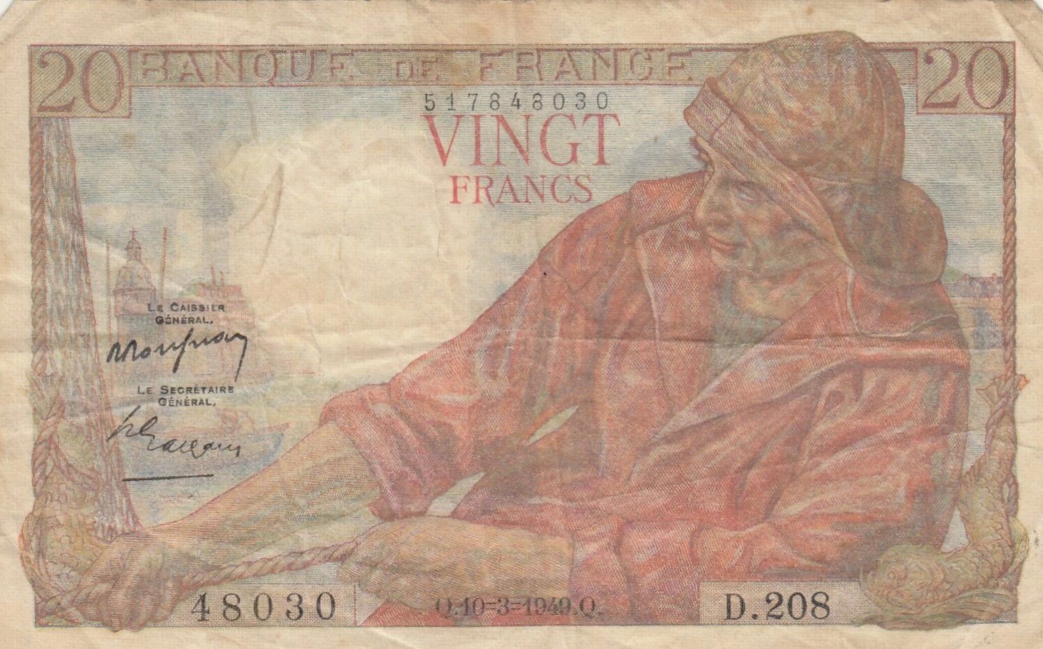 Le billet de 20 Francs, type Pêcheur, émis le 10 mars 1949, représente une unité monétaire de la France. Il s'agit d'un billet de banque faisant partie de la série D.208.