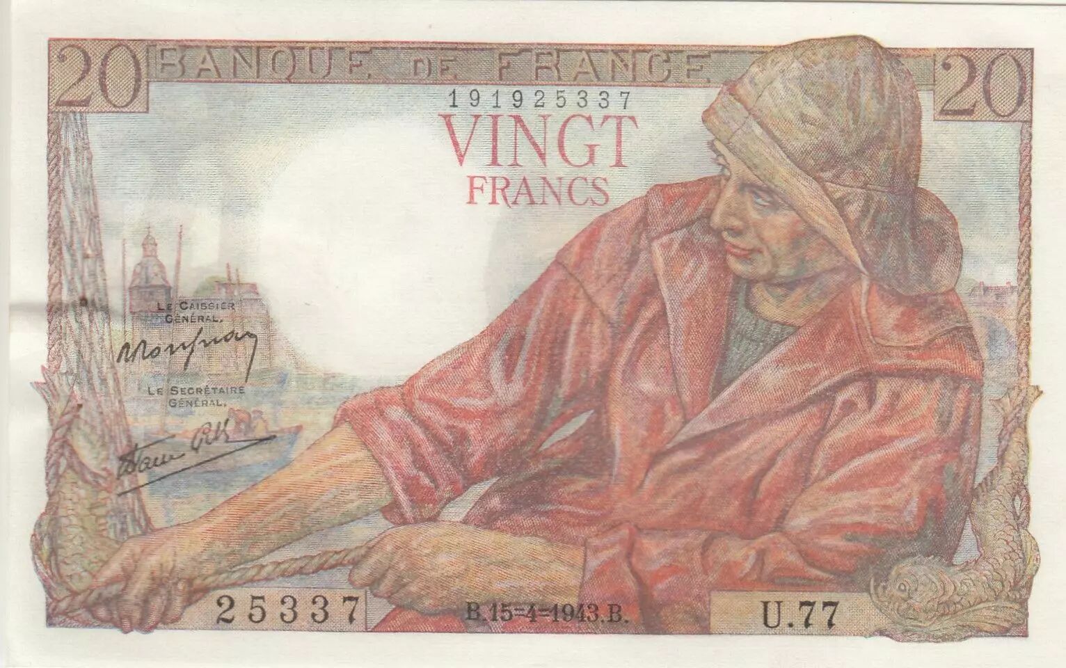 Billet France 20 Francs - Pêcheur - 15-04-1943 - Série U.77