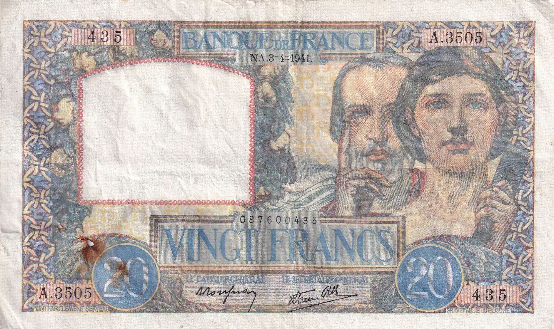 Banknote France 20 Francs - Science and Industry - 03-04-1941 - Serial A.3505 - P.92