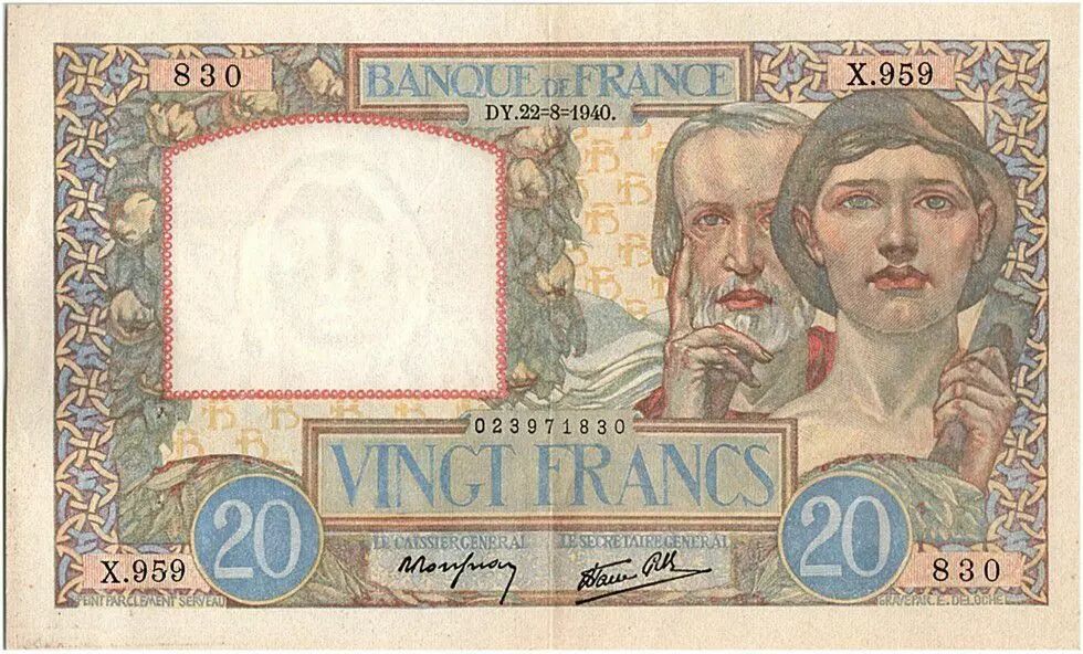 Banknote France 20 Francs Science and Industry - 22-08-1940 Serial X.959