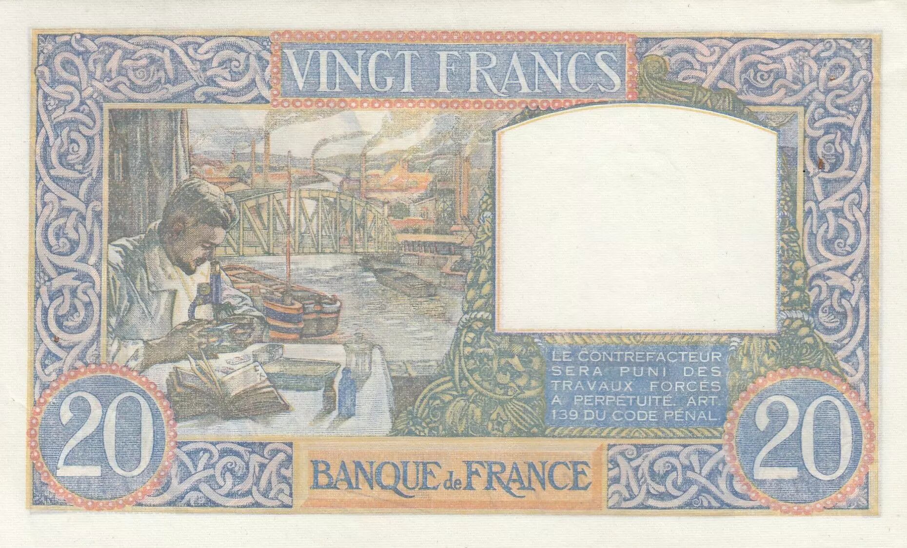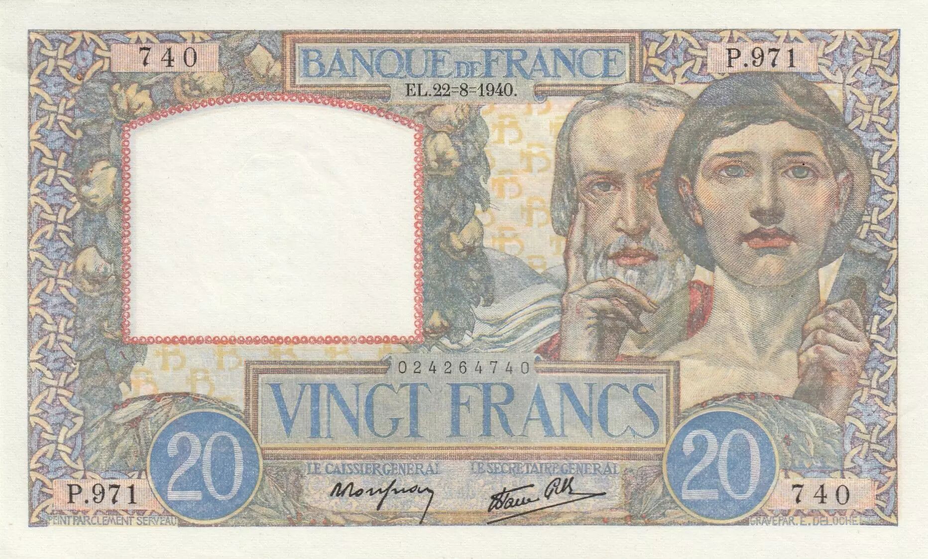 This French banknote has a face value of 20 francs. It was issued in 1940.