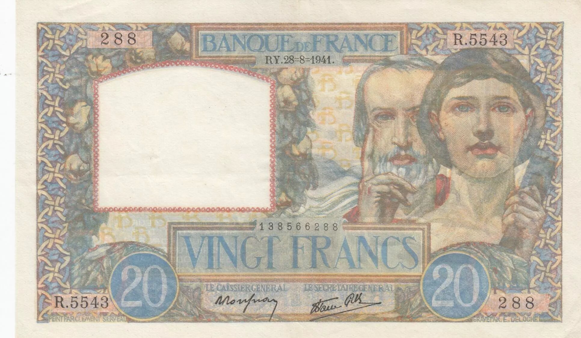 Banknote France 20 Francs Science and Labour - 28-08-1941 Serial R.5543 - XF