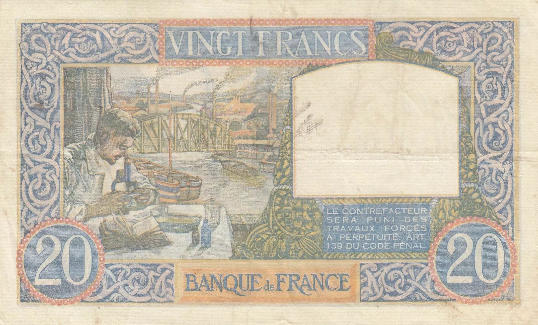 Banknote France 20 Francs - Science and work - 03-10-1940 - Serial R.1228
