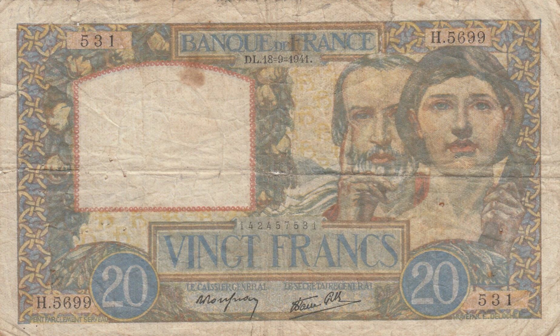This French banknote was issued on September 18, 1941. It is a 20 franc note, part of the H.5699 series.