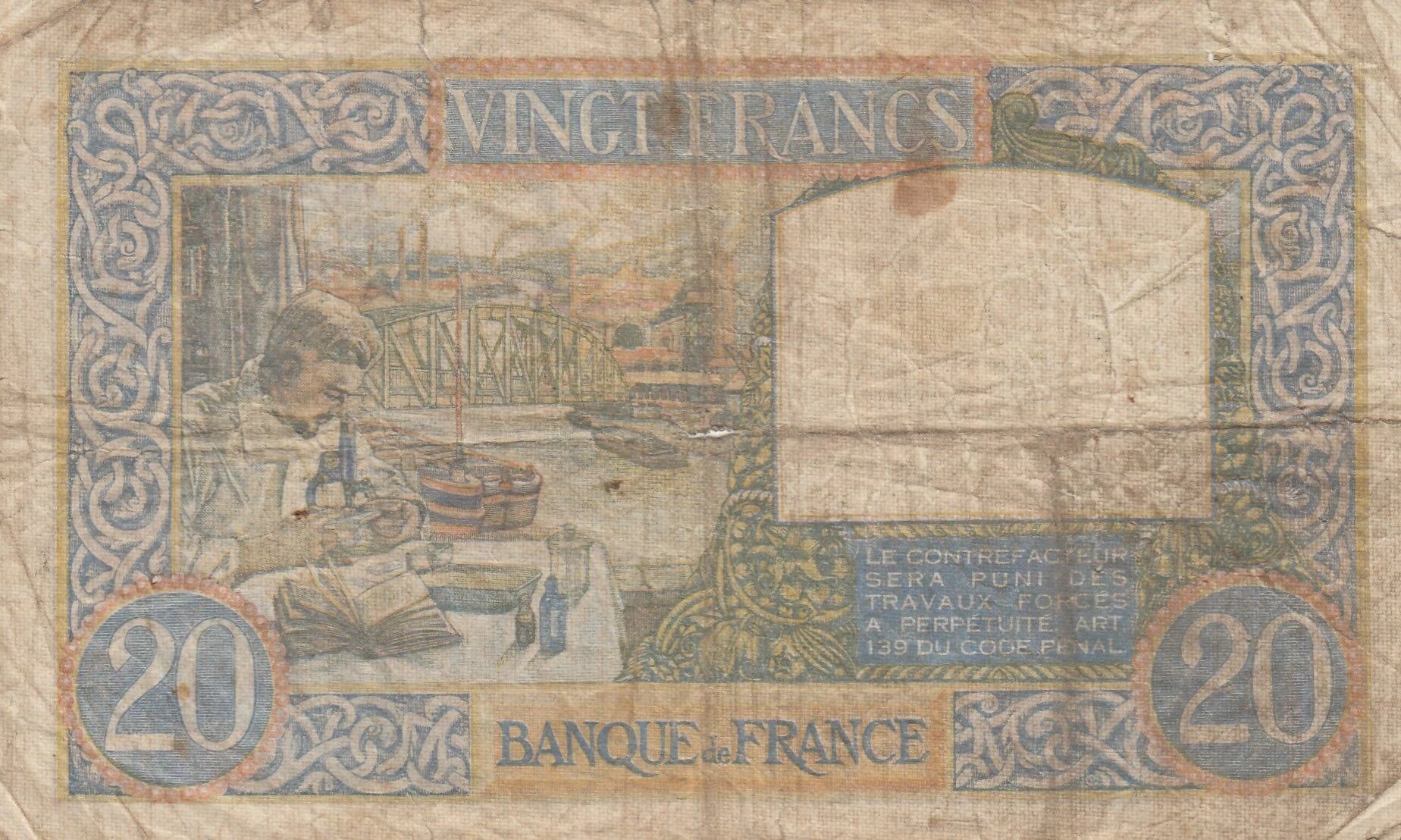 This 20 franc note was issued in a particular historical context, marked by the Second World War and the occupation of France. It bears witness to the values and ideals promoted by the Vichy regime, which emphasized work, family, and homeland. The representation of Science and Labor on this note reflects the desire to rebuild the country and restore its economic and industrial greatness.