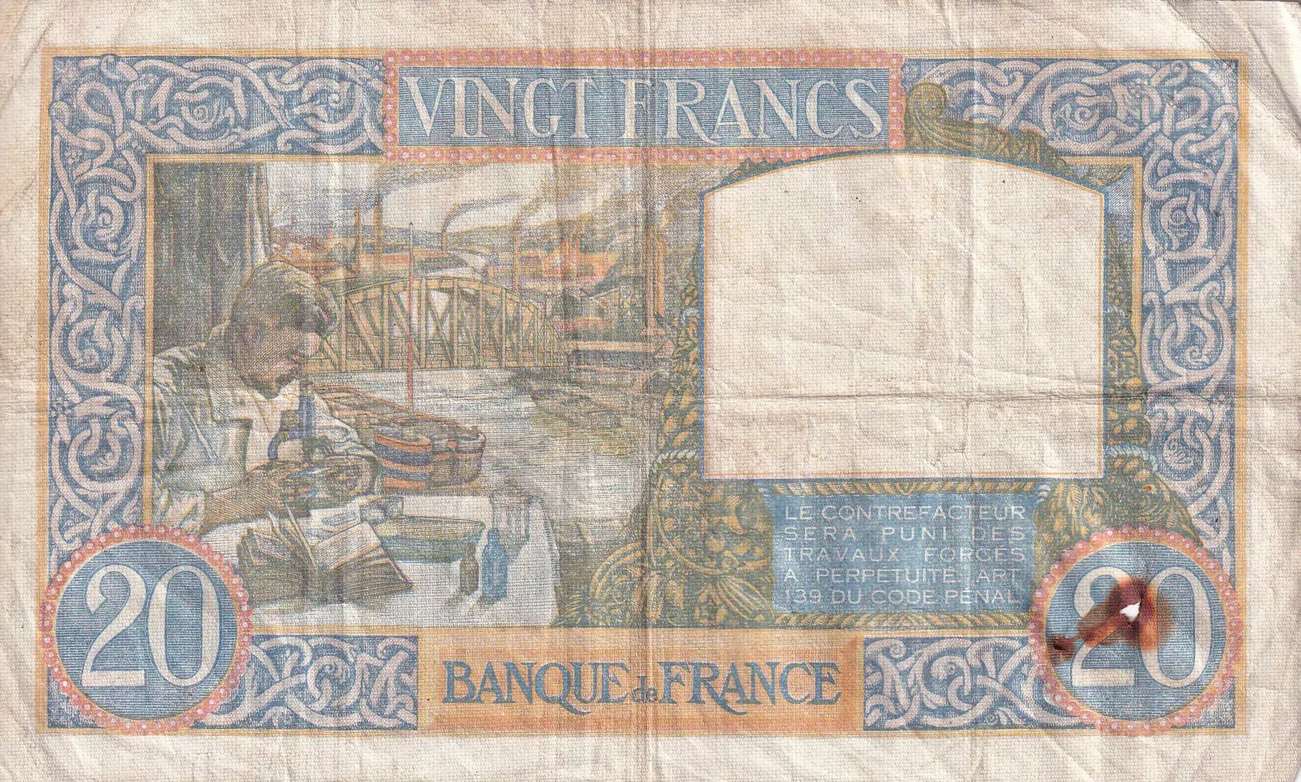 Accueil > Billets Français > Billets Banque de France > Billets 20 Francs > Science et Travail type 1940 (1939-1942) > France 20 Francs - Science et Travail - 01-08-1940 - Série O.830 - F.12.05