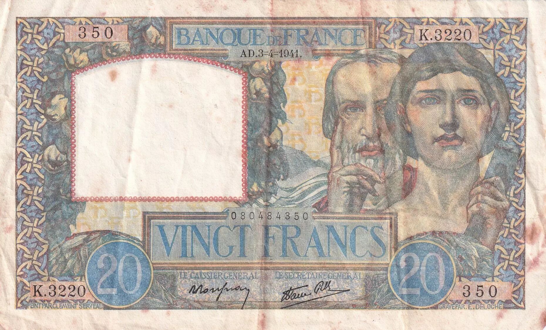 Billet France 20 Francs Science et Travail - 03-04-1941 Série K.3220