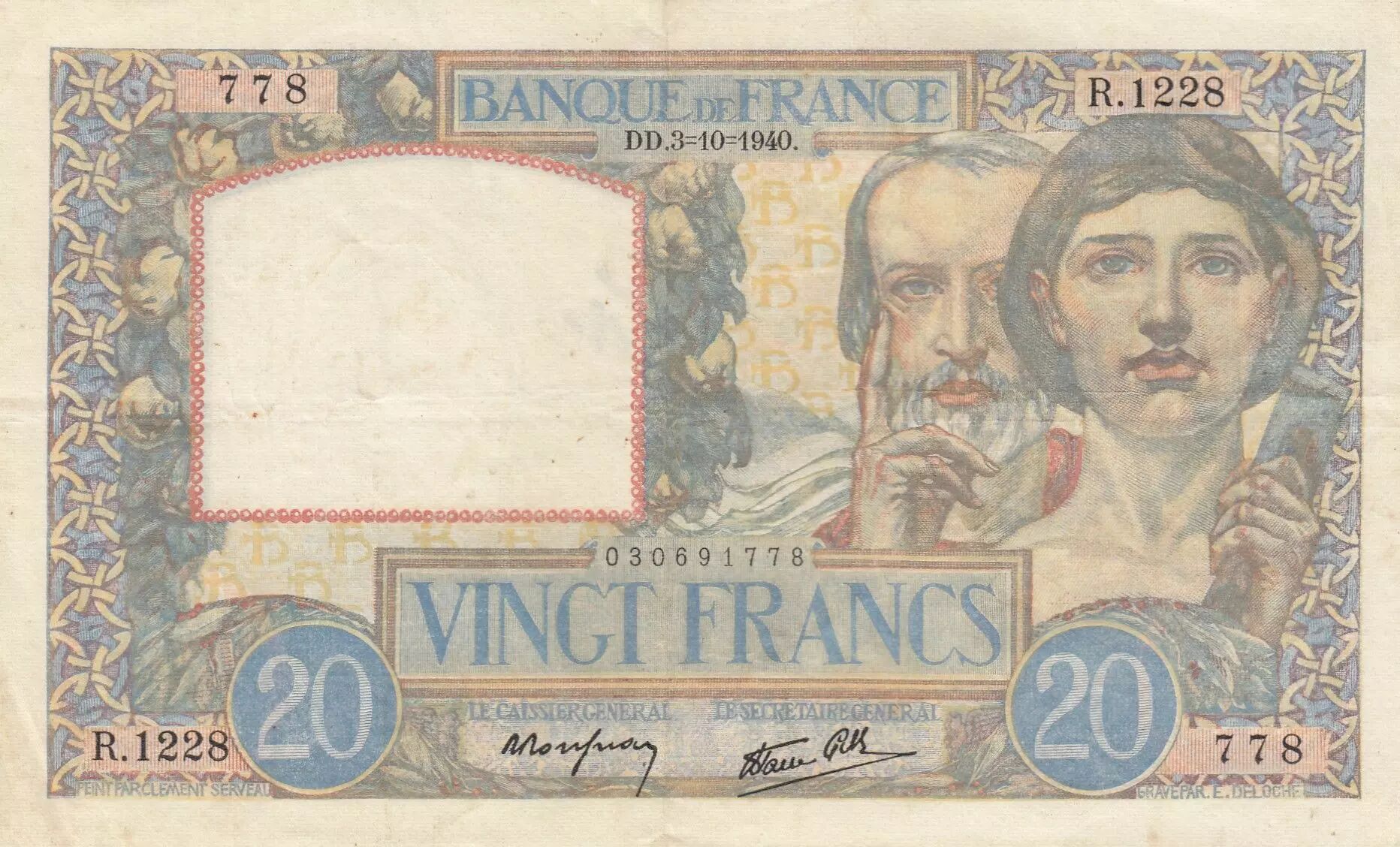 Billet France 20 Francs - Science et Travail - 03-10-1940 - Série R.1228