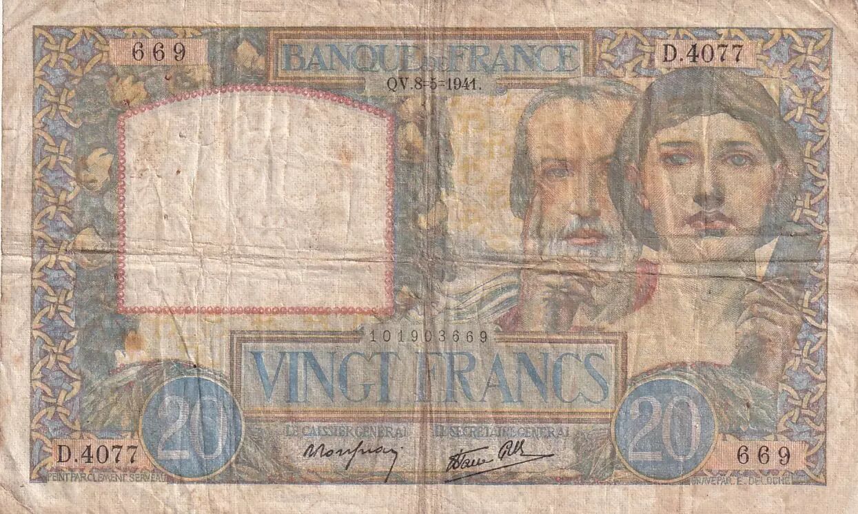 Billet France 20 Francs Science et Travail - 08-05-1941 - Série D.4077