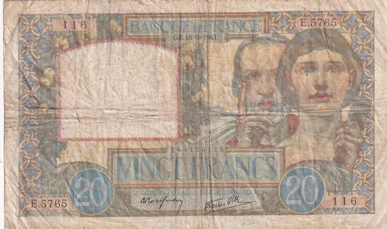 Billet France 20 Francs Science et Travail - 18-09-1941 - Série E.5765