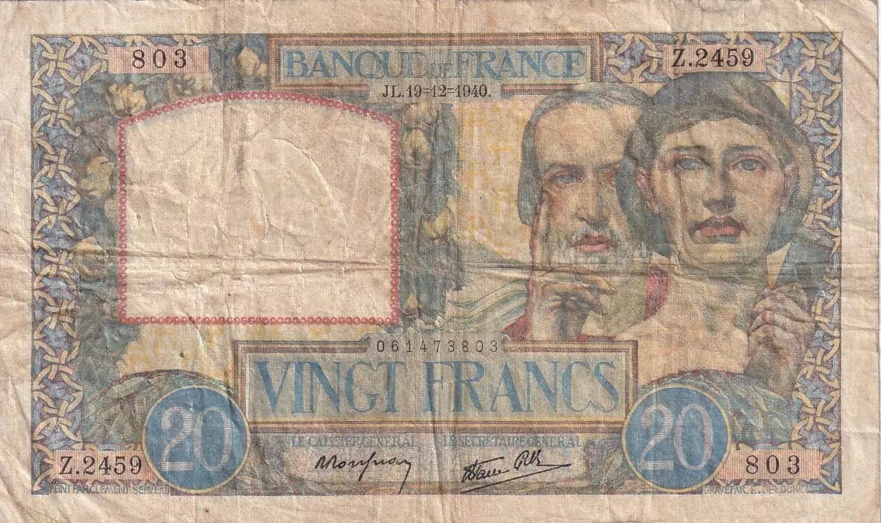 Billet France 20 Francs Science et Travail - 19-12-1940 - Série Z.2459