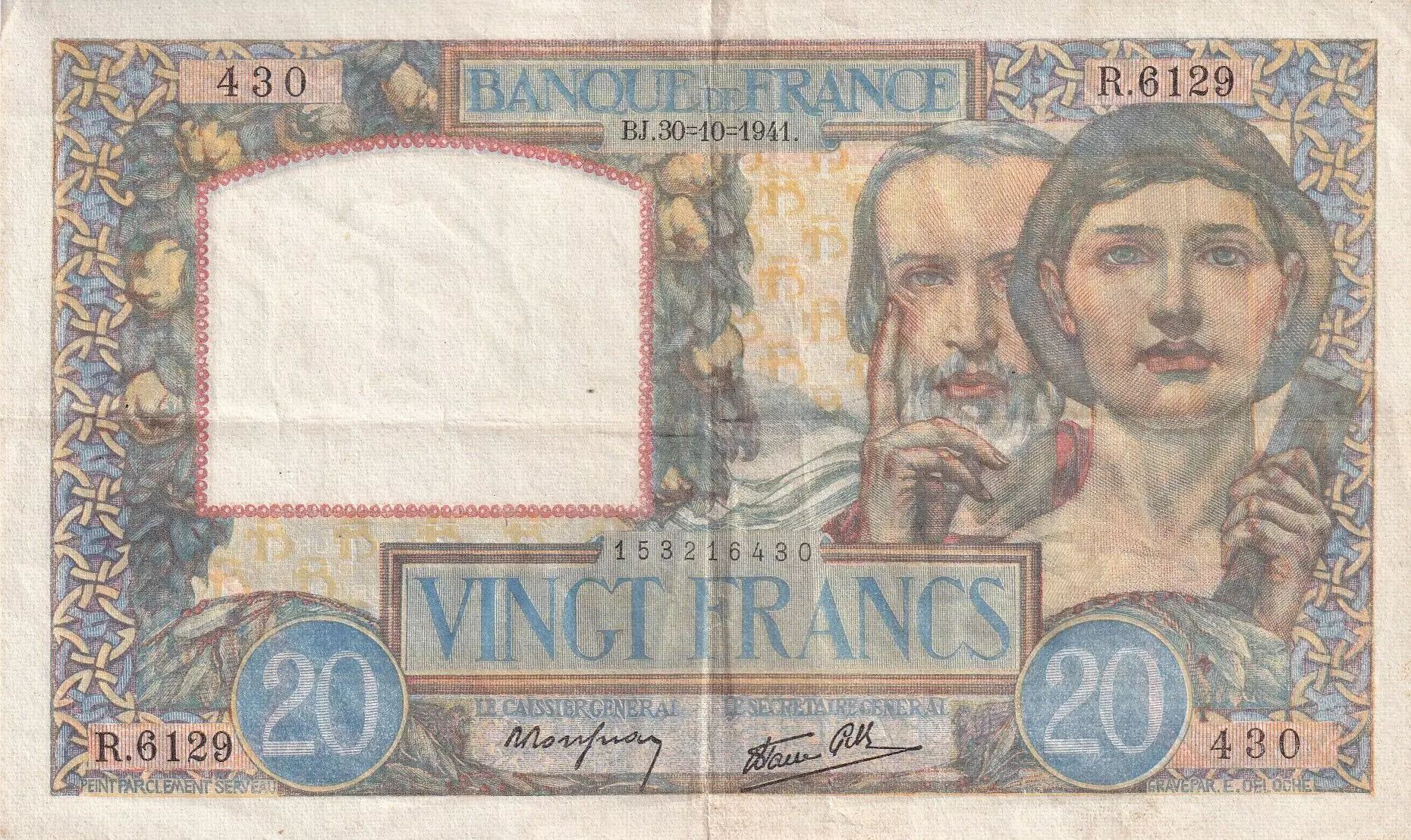 Accueil > Archivage > France 20 Francs - Science et Travail - 30-10-1941 - Série R.6129 - F.12.19