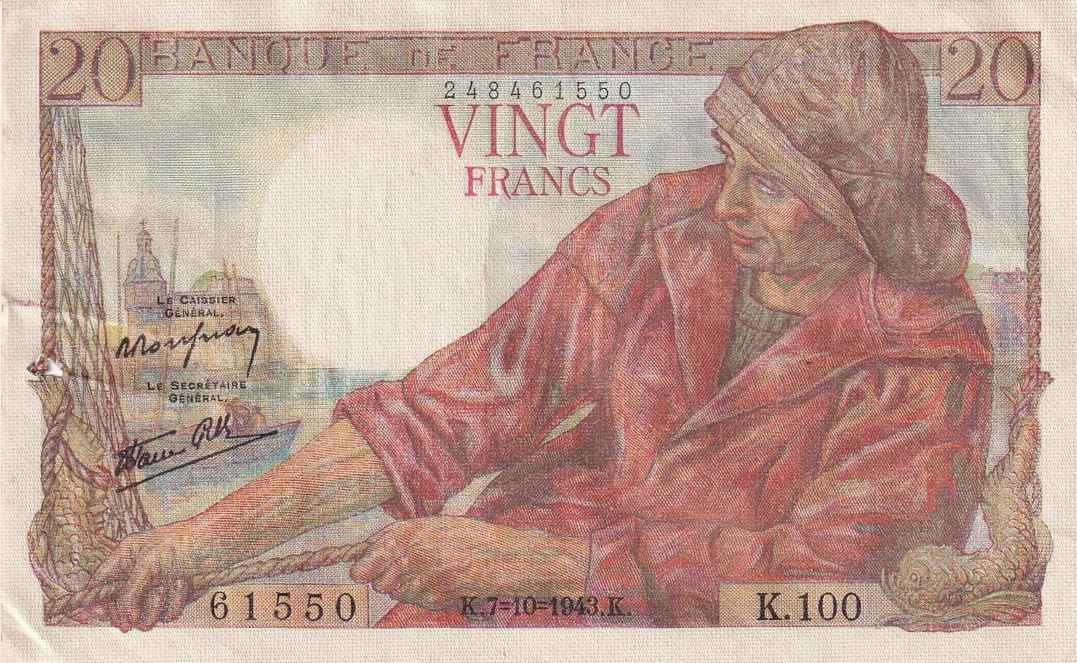 Home > > France 20 Francs - Sheperd - 07-10-1943 - Serial K.100 - VF+ - P.100a