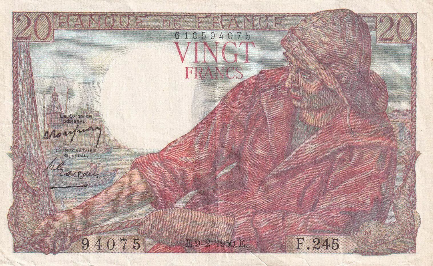 Home > French Banknotes > Bank of France Banknotes > 20 Francs Banknotes > Fisherman Type 1942 (1942-1950) > France 20 Francs - Sheperd - 09-02-1950 - Serial F.245 - P.100c