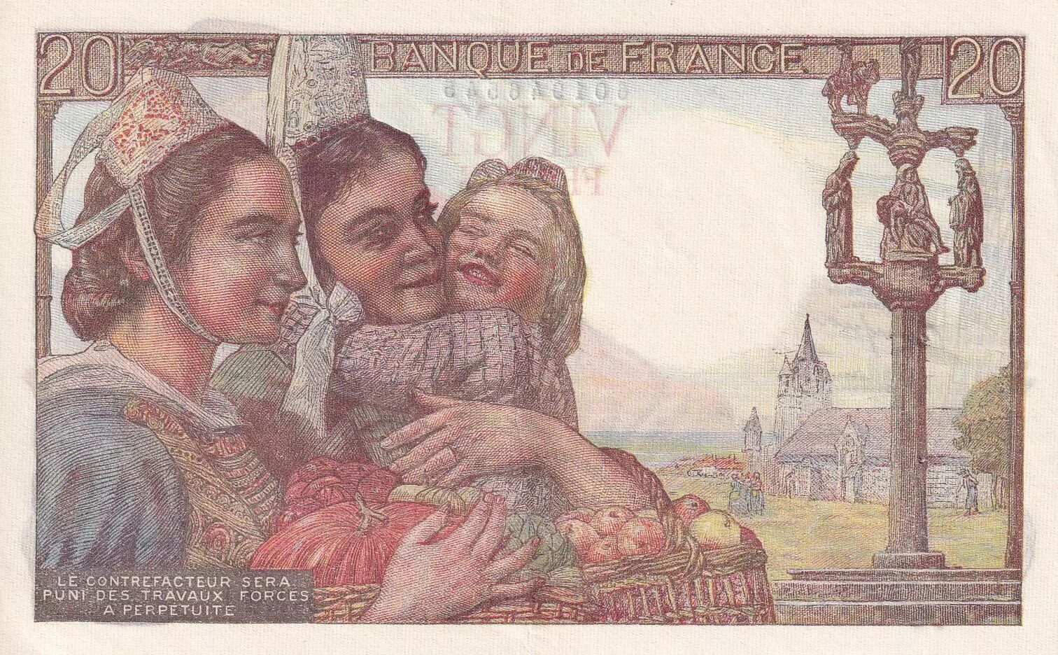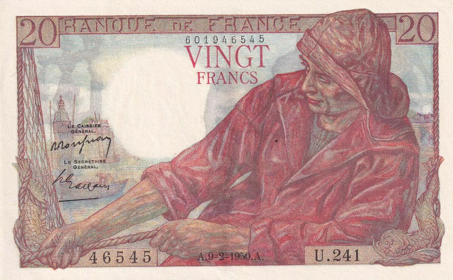 Home > French Banknotes > Bank of France Banknotes > 20 Francs Banknotes > Fisherman Type 1942 (1942-1950) > France 20 Francs - Sheperd - 09-02-1950 - Serial U.241 - XF - P.100d