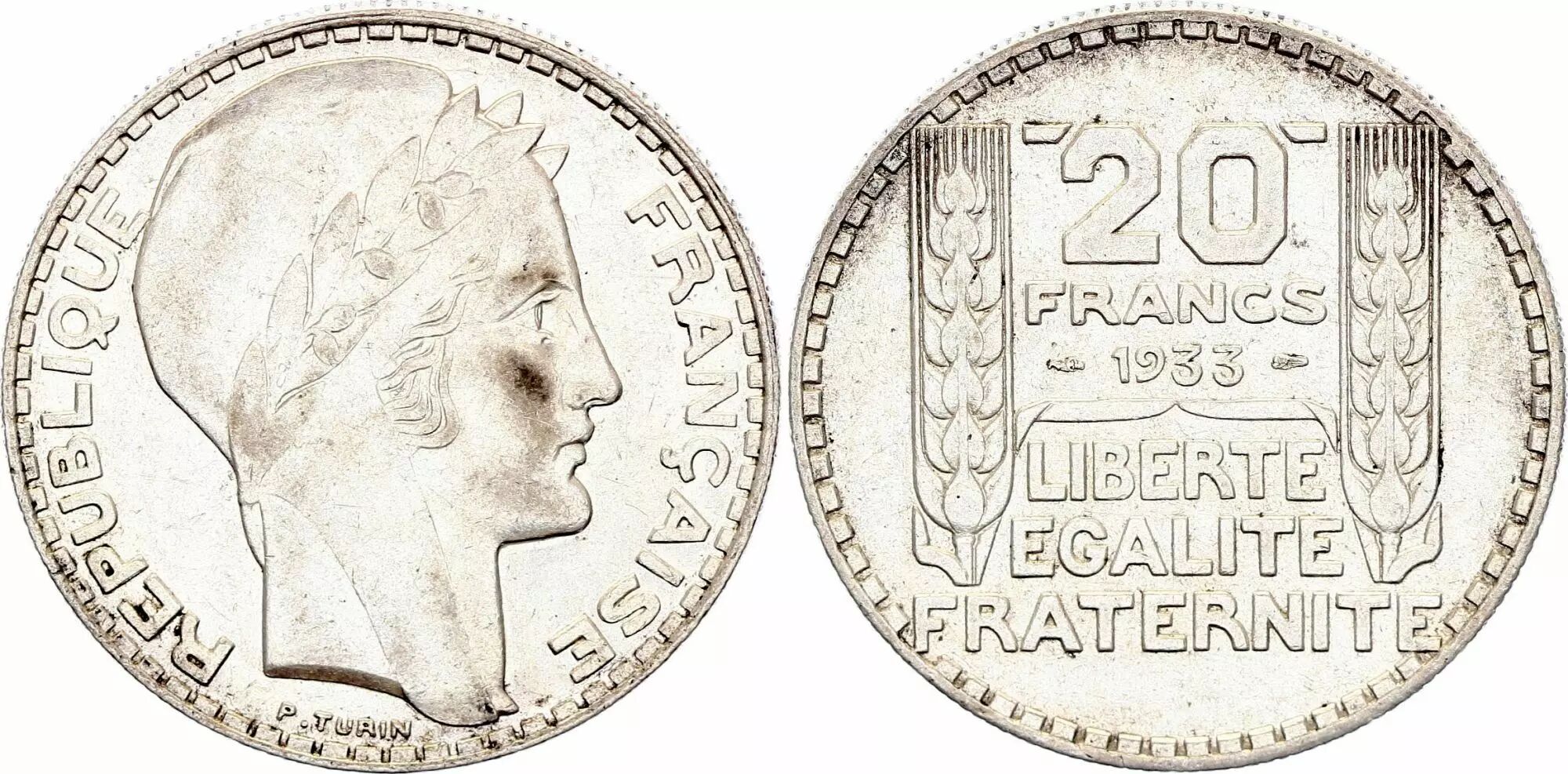 • Revers : La valeur faciale "20 FRANCS" entourée par une couronne de branches de chêne et d'olivier, avec la mention "LIBERTE EGALITE FRATERNITE" en haut.