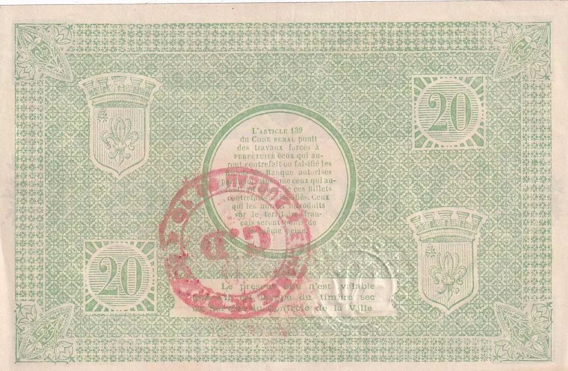 Le verso du billet contient un avertissement légal, citant l'article 139 du Code pénal, qui stipule les peines encourues pour la contrefaçon ou la falsification de billets de banque autorisés par la loi, ainsi que pour l'utilisation ou l'introduction de tels billets contrefaits sur le territoire français. Il est également précisé que le billet n'est valable que s'il est frappé du timbre sec du Service du Contrôle de la Ville.