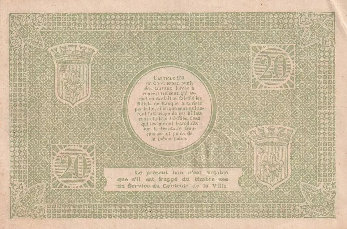 Le verso du billet contient des informations légales importantes visant à prévenir la contrefaçon. L'article 139 du Code pénal est cité, rappelant les peines encourues par ceux qui contrefont, falsifient ou utilisent de faux billets de banque autorisés par la loi, ainsi que ceux qui les introduisent sur le territoire français. Une mention spécifique indique que le bon n'est valable que s'il est frappé du timbre sec du Service du Contrôle de la Ville, ajoutant une sécurité supplémentaire contre la falsification. L'imprimeur, Imprimerie L. Danel, Lille, France, est également mentionné au verso.
