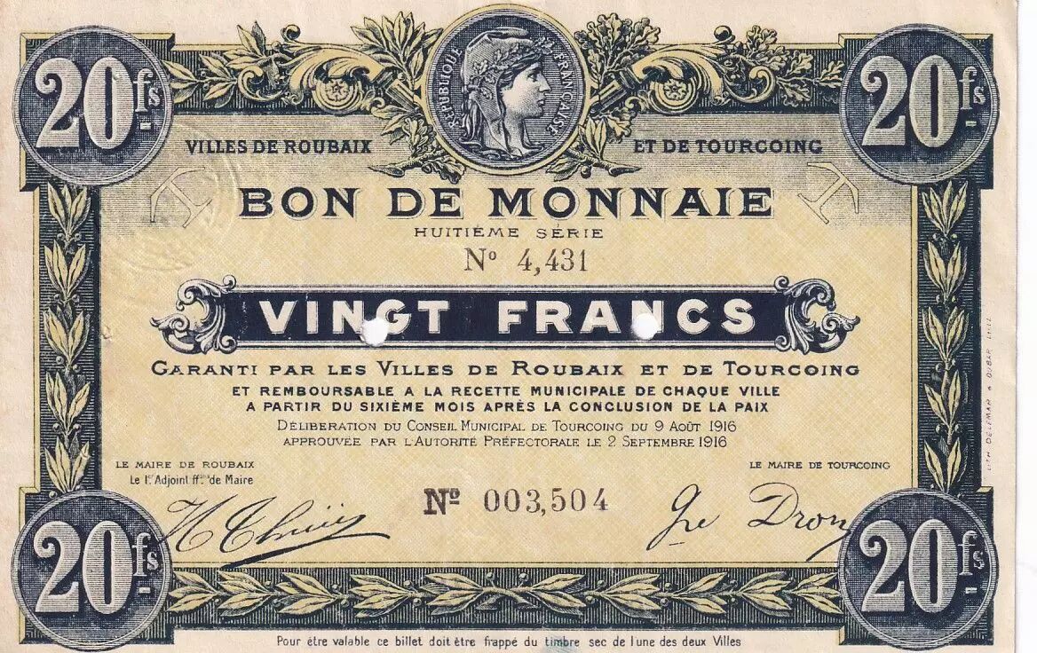 Ces billets de nécessité ont été produits en réponse aux pénuries de monnaieDivision territoriale française, le département est une circonscription administrative dépendant de l'État. More courante durant la Première Guerre mondiale. Les autorités locales et les chambres de commerce ont été autorisées à émettre leur propre monnaie pour faciliter les transactions économiques au sein de leur communauté.