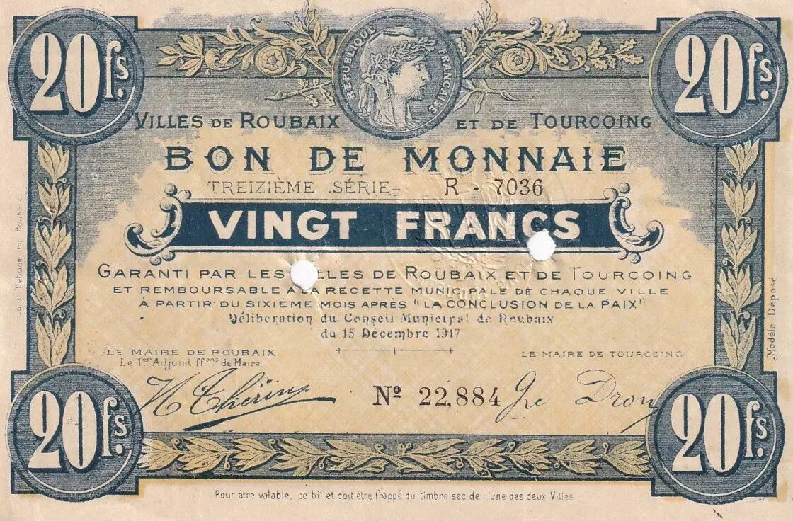 Ce billet de nécessité, d'une valeur nominale de 20 francs, a été émis le 15 décembre 1917. Il s'inscrit dans la 13ème série de billets émis par les villes de Roubaix et Tourcoing, situées dans le département du Nord. Cette émission relève des "Nécessités Communes et Villes" émises entre 1914 et 1918, une période marquée par les contraintes économiques et financières de la Première Guerre Mondiale.