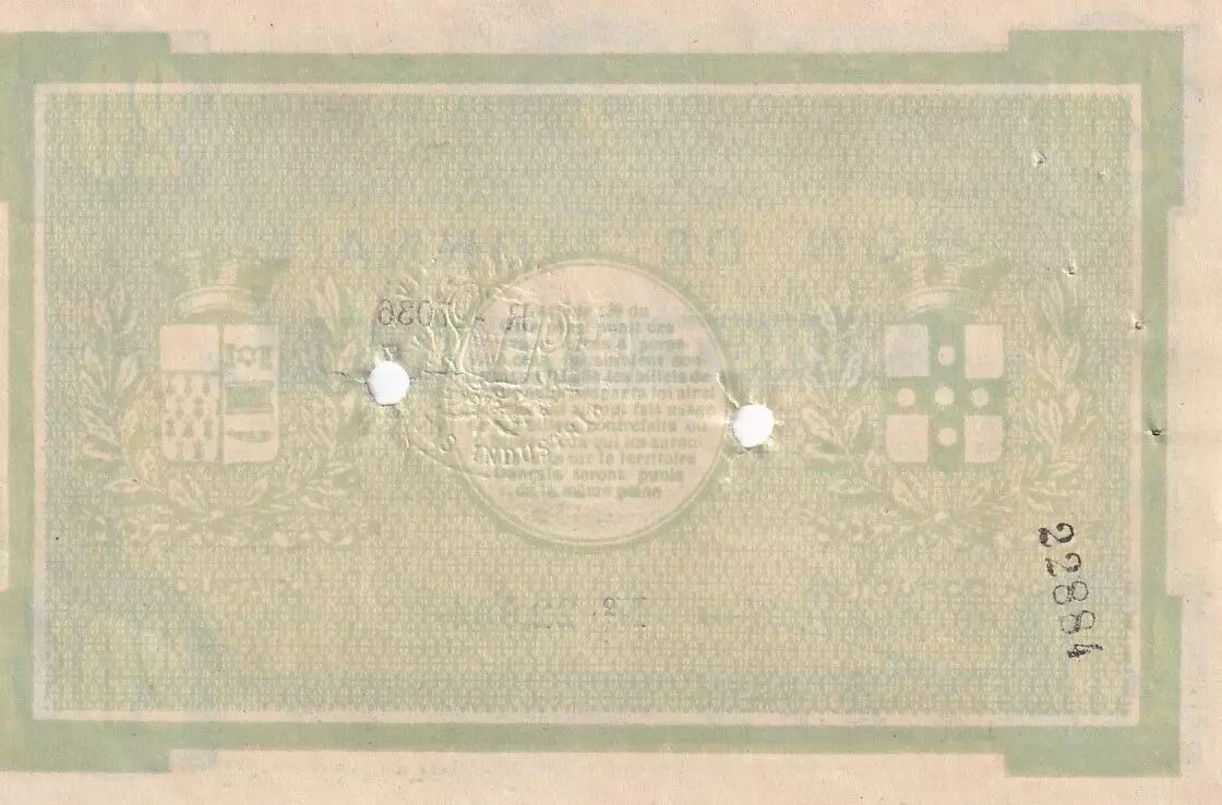 L'état de conservation de ce billet est marqué par des traces d'annulation résultant de perforations. Ces perforations indiquent que le billet a été retiré de la circulation après avoir été utilisé, une pratique courante pour éviter sa réutilisation frauduleuse. La présence de ces marques d'annulation constitue un élément important de l'histoire du billet, témoignant de son utilisation effective et de son parcours à travers le temps. Ce type de billet représente un témoignage tangible des défis économiques et des solutions mises en ?uvre par les communautés locales pendant la Première Guerre Mondiale.