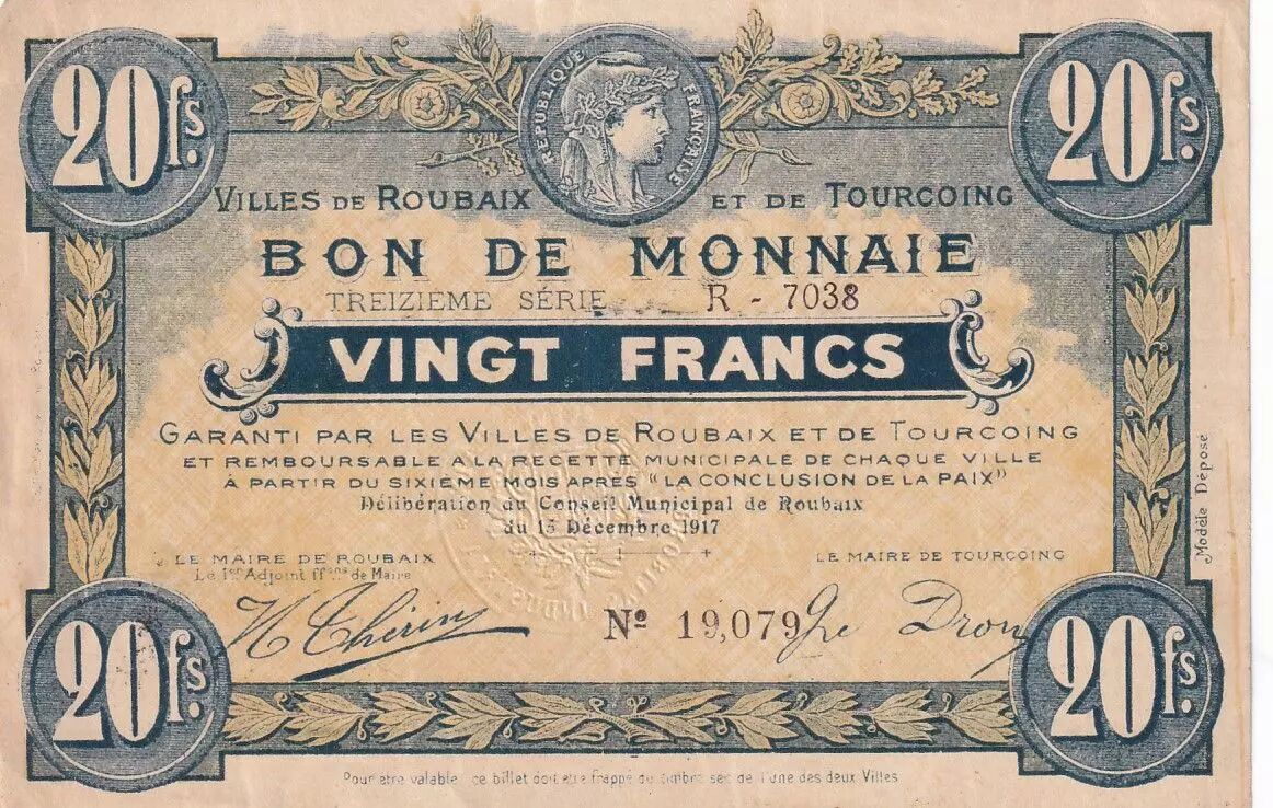 Ce billet de nécessité, émis par les villes de Roubaix et Tourcoing, témoigne du contexte économique particulier de la France durant la Première Guerre mondiale. Daté du 15 décembre 1917, il appartient à la 13ème série de ces émissions locales.