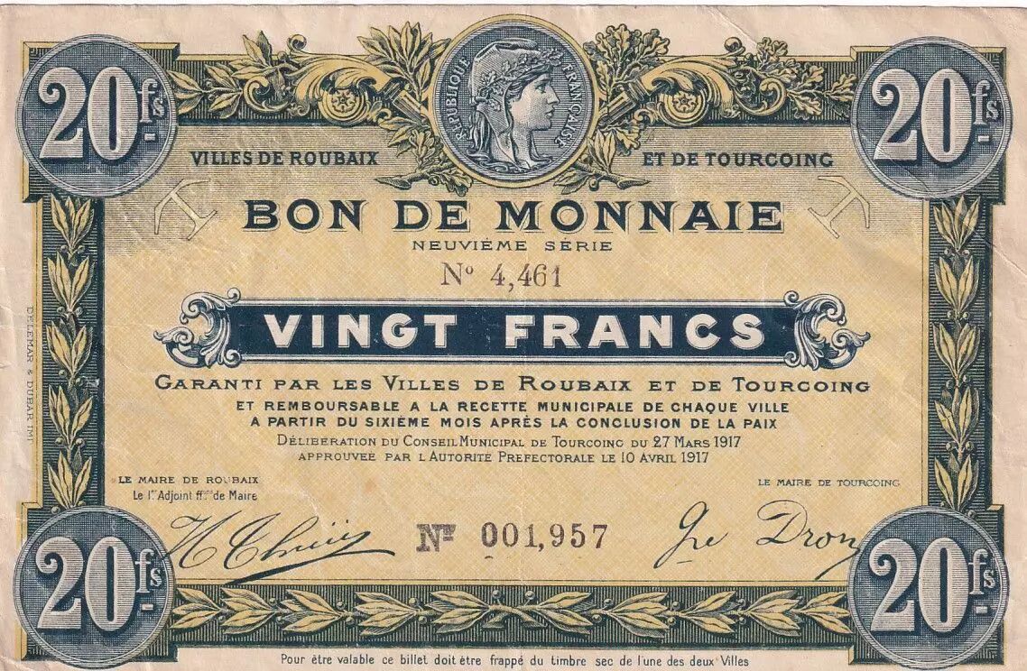 This emergency banknote, with a nominal value of 20 francs, was issued by the cities of Roubaix and Tourcoing in France. The date of issue indicated on the banknote is March 27, 1917. It belongs to the 10th series of emergency issues.