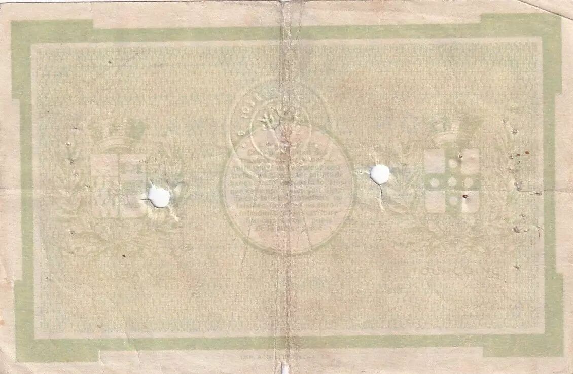 Il est important de noter que ce billet présente des traces d'annulation par perforation, indiquant qu'il a été retiré de la circulation après avoir été utilisé. Ces perforations étaient une méthode courante pour empêcher la réutilisation des billets annulés.